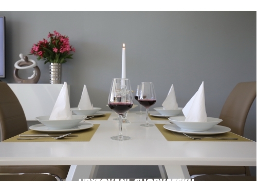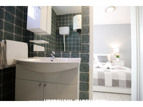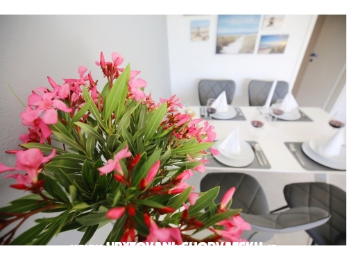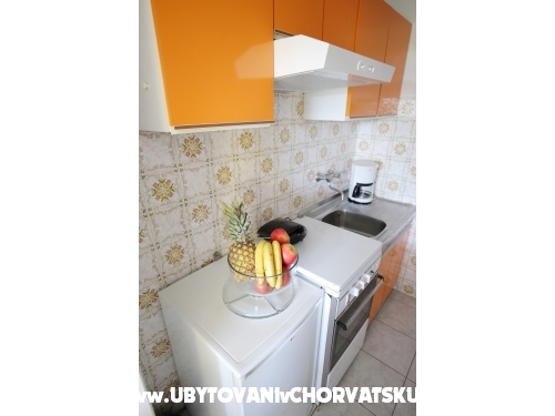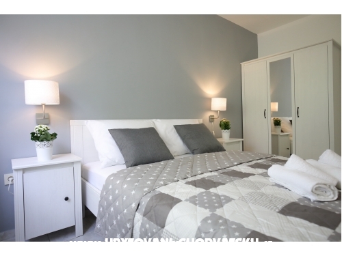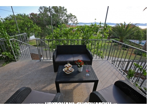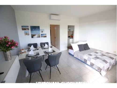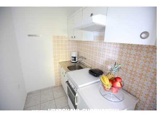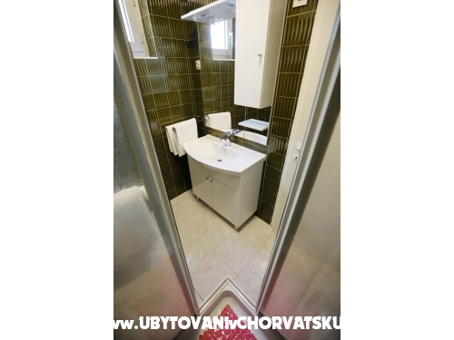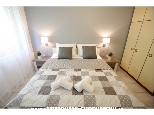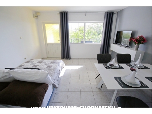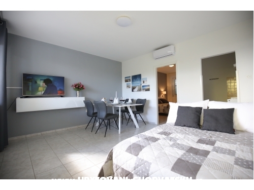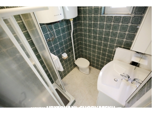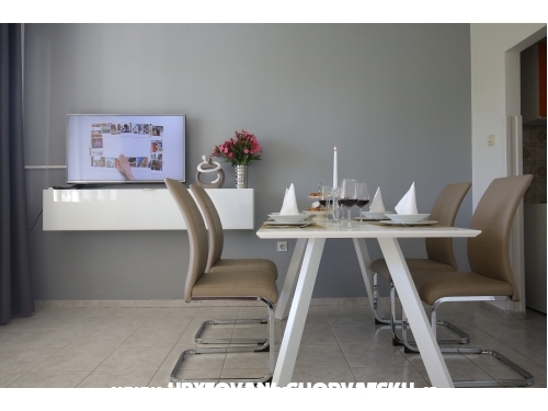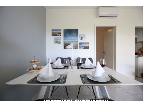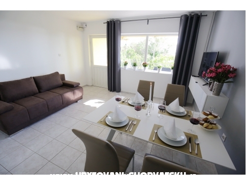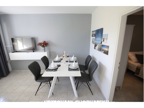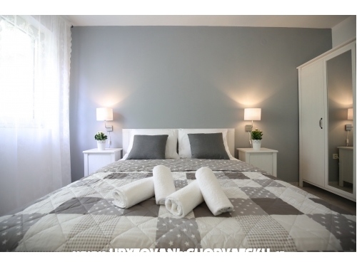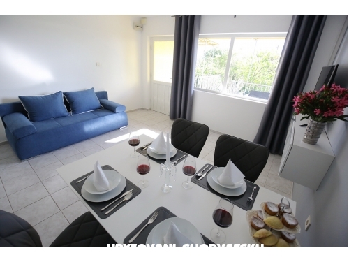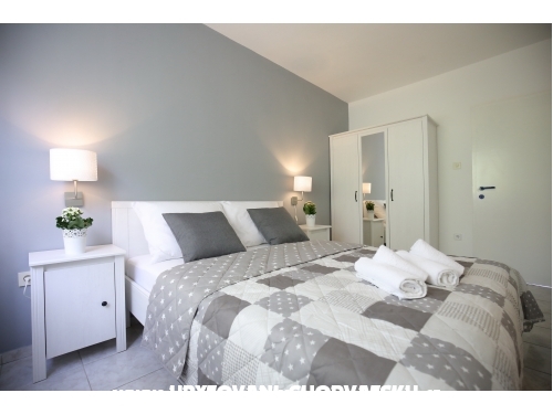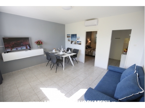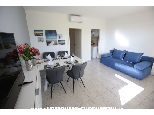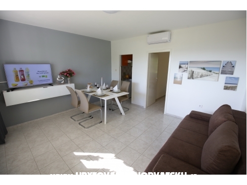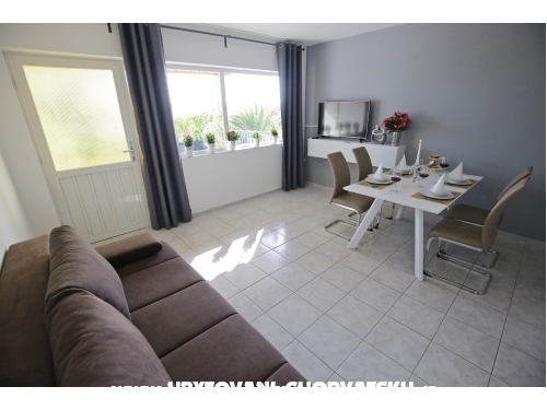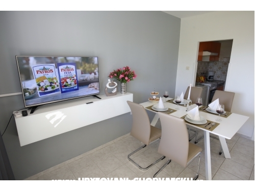 kuća ima 4 jednaka apartmana 2+2, svaki apartman ima kuhinju, sobu, wc, dnevni boravak s ležajem za dvoje, veliku terasu.