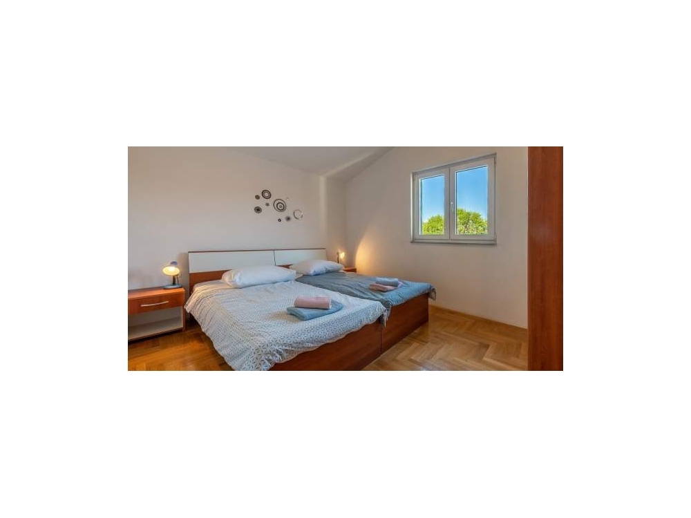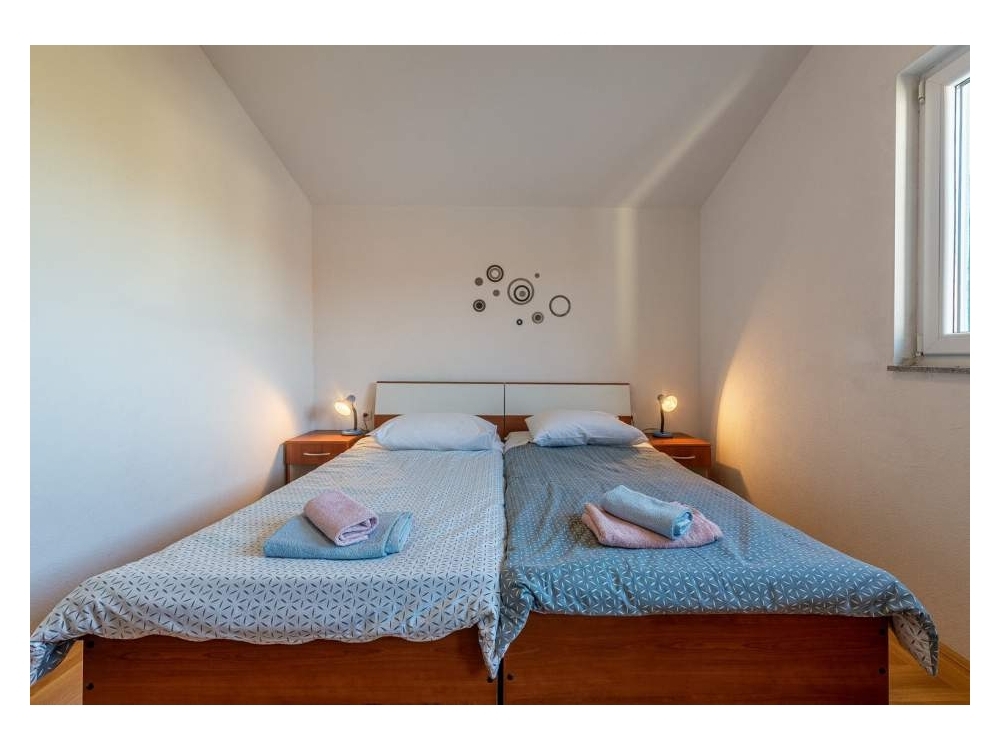 První apartmán s jednou ložnicí je v přízemí, druhý v podkroví a oba mají velkou terasu. Apartmán se dvěma ložnicemi má také velkou terasu s výhledem na celou Grebasticu. Ve dvoře máme dostatek parkovacích míst pro vaše auta.