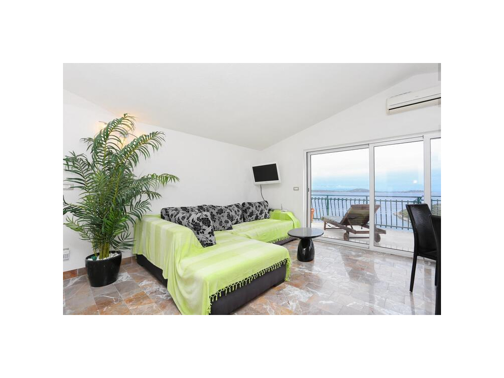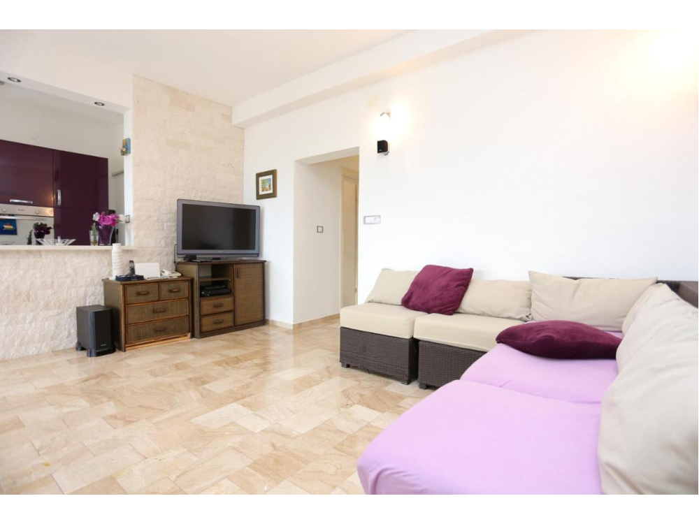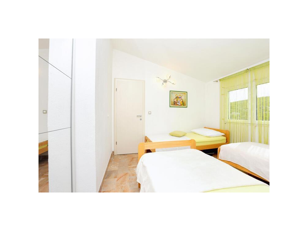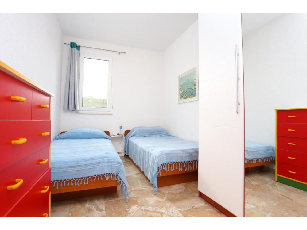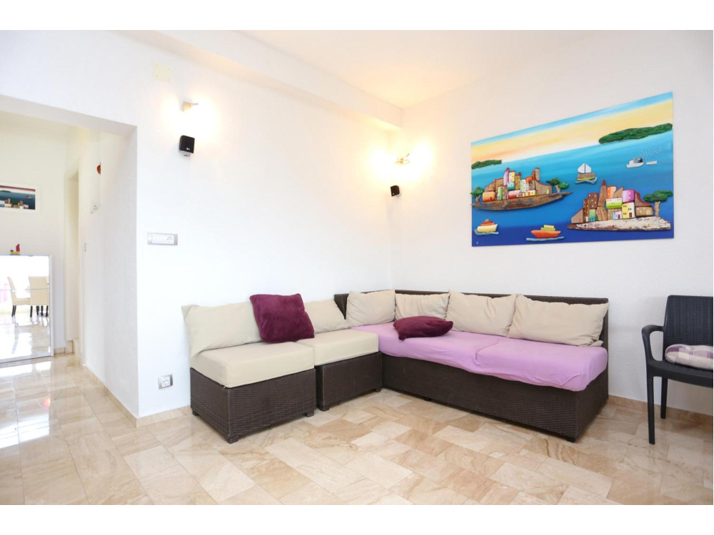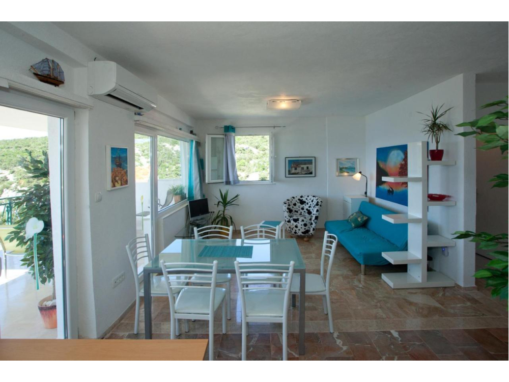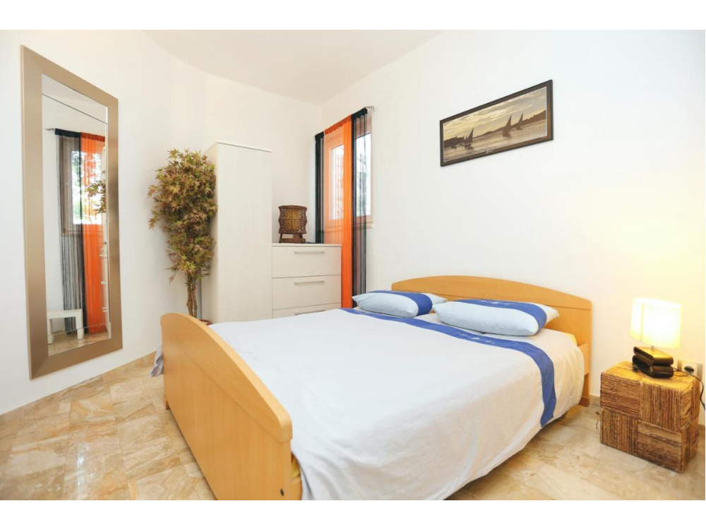 "AP.SONJA" - 1 obývací pokoj, 2 samostatné ložnice a 1 koupelna se sprchou. V kuchyni najdete varnou desku, lednici, myčku nádobí a kuchyňské nádobí. Apartmán má také gril. Terasa s výhledem na moře, klimatizace a TV-SAT.