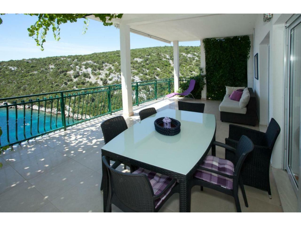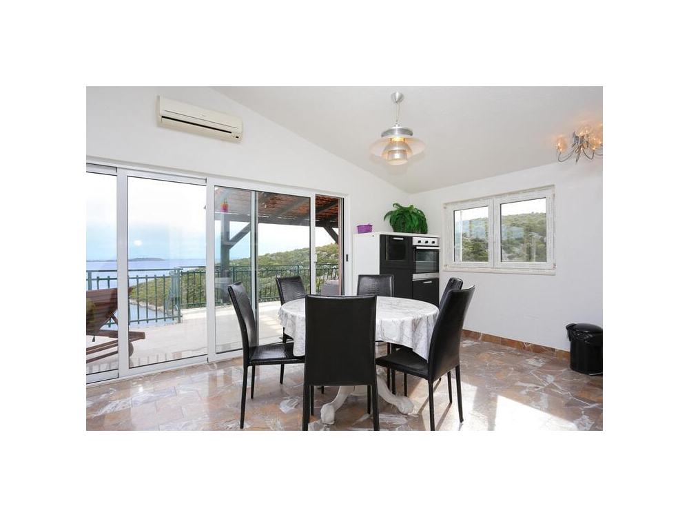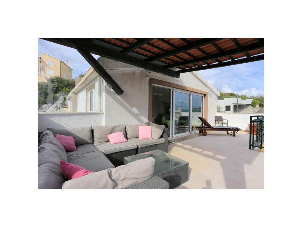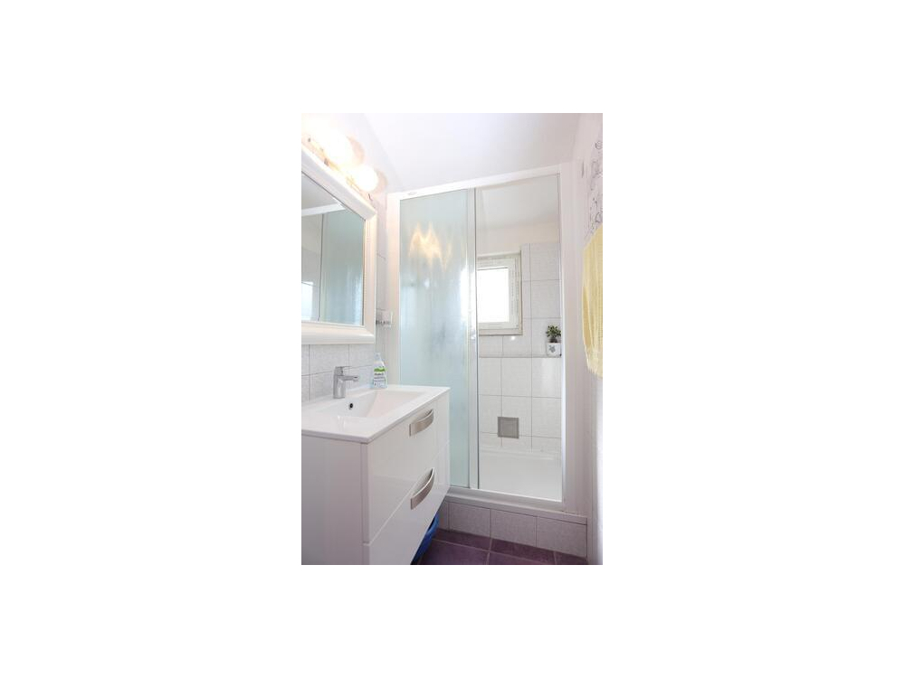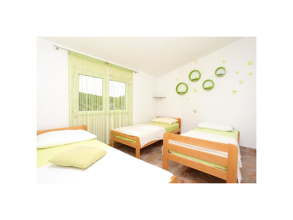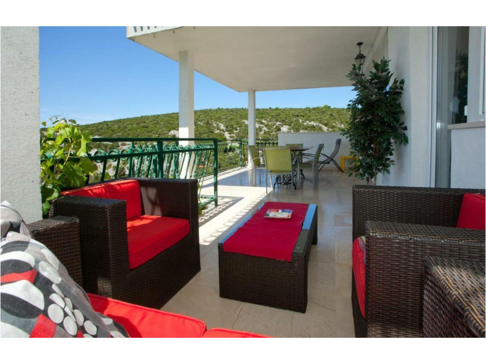 "AP.VERA" - Tento prostorný apartmán má 3 ložnice, 2 koupelny s vanou, posezení a terasu, kde si můžete odpočinout. Dobře vybavená kuchyň. Klimatizovaný apartmán má TV, pračku, soukromý vchod a jídelní kout s výhledem na moře.