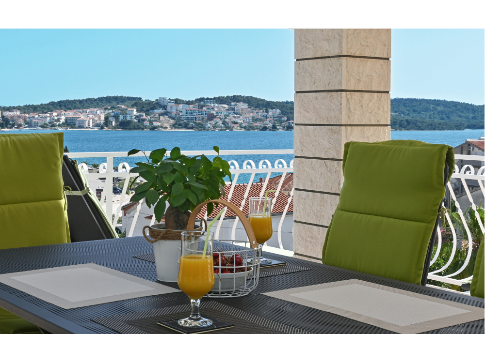 Apartmán se nachází v prvním patře a je vhodný pro 7 osob. Apartmán má dvě ložnice, kuchyň, obývací pokoj, dvě toalety a koupelnu. Jeden pokoj s manželskou postelí, druhá ložnice s dvojlůžkem a jedním samostatným lůžkem. V obývacím pokoji je rozkládací gauč vhodný pro dvě děti. V apartmánu je plně vybavená kuchyň, klimatizace, LCD televize se satelitním příjmem, myčka, pračka, přístup k internetu. K apartmánu náleží parkovací stání, 30 m2 terasa s výhled na moře.